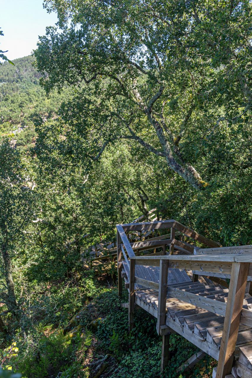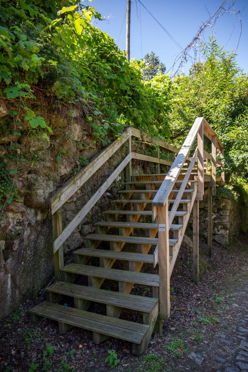 A escadaria em madeira, como que um passadiço em zigue-zague, percorre a aldeia desde a Rua da Barreira até ao Outeiro da Vila, junto à capela de Nossa Senhora de Fátima, no centro de Macieira de Alcôba.